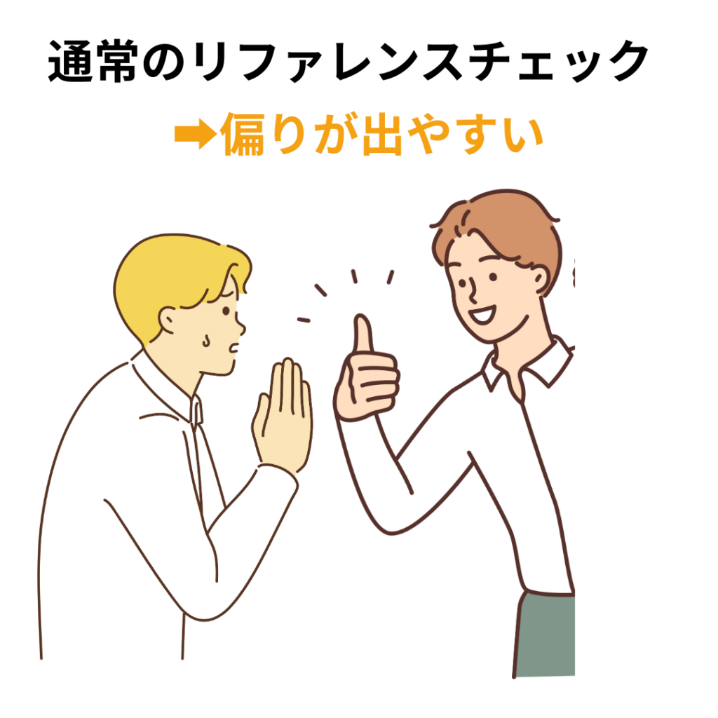 リファレンスチェックの課題は、前職の誰から聴取するか?にあります。多くの企業では、採用候補者が推薦した関係者(推薦人)から聴取します。普通は気の知れた同僚や上司ですから、良いことをいうでしょうし、誰もリスクを取って悪いことを言おうとは思いません。そうすると、本来の「チェック」という目的からは離れてしまいます。